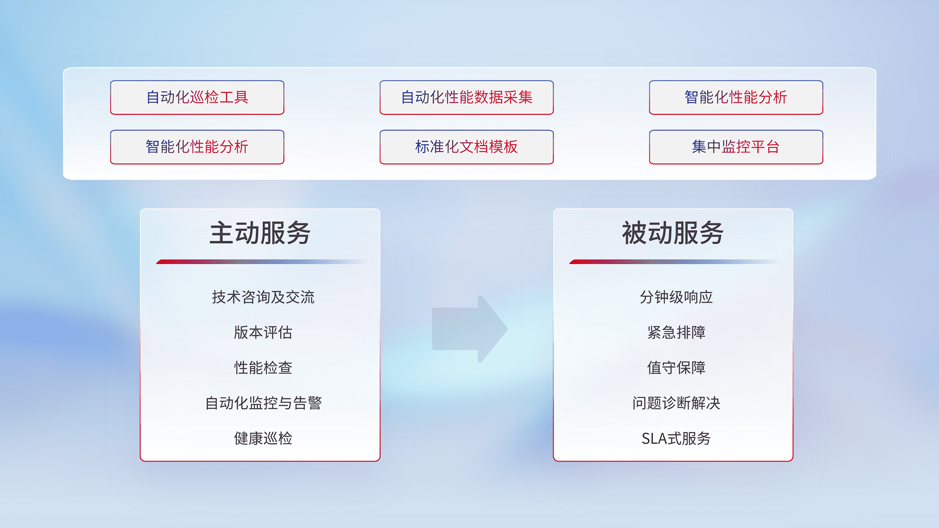智能化工具和标准化文档,,,保障服务质量,,提供主动服务(包含技术咨询、、、版本评估、、、性能检查、、自动化监控与告警、、、、健康巡检)和被动服务包含(分钟级响应、、紧急排障、、、值守保障、、、、问题诊断解决、、、SLA服务)。。。